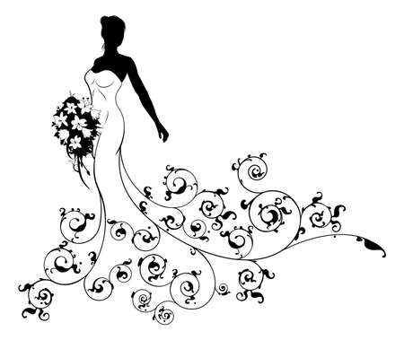 花嫁の結婚式のシルエット デザイン 抽象花模様の花の花の花束を持って白ブライダル ドレス ドレスの花嫁のイラスト素材 ベクタ Image